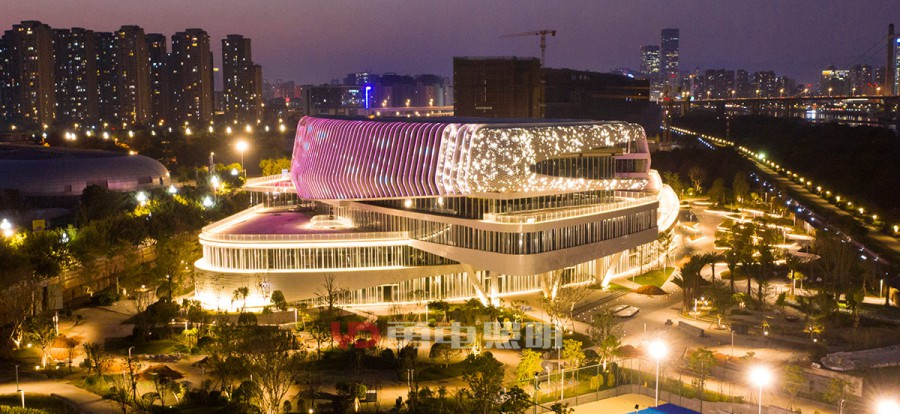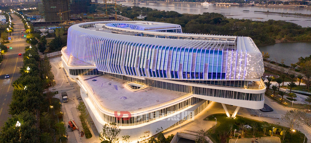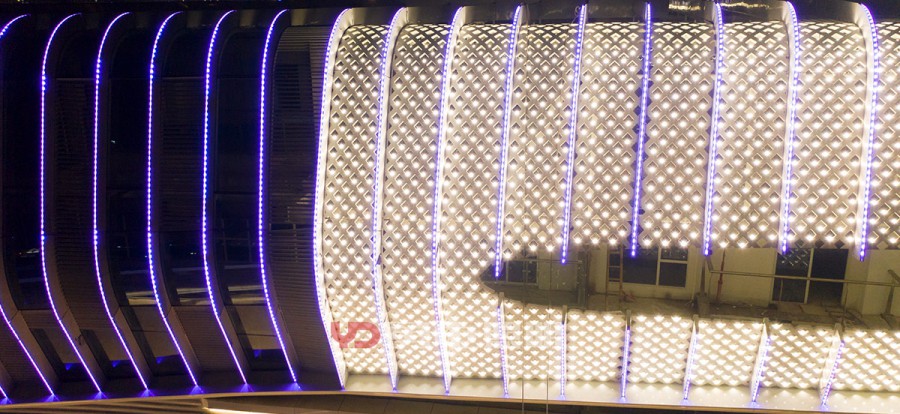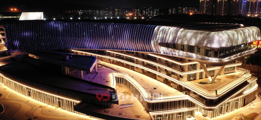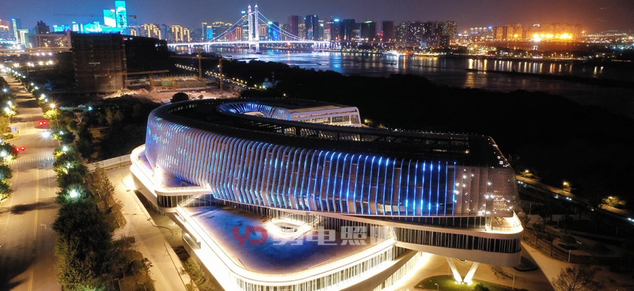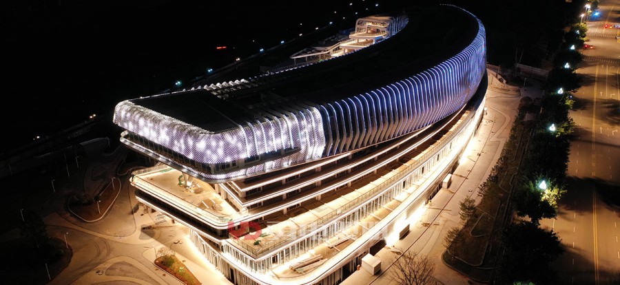 該項目為兩座造型新穎建筑,位于閩江邊,背靠海峽國際會展中心,地理位置優(yōu)越,夜景視野出色,對亮燈效果要求高。為了保證建筑外觀及幕墻內(nèi)部的美觀性,故將燈具的走線都放在鋁板里面,幕墻鋁板只留一個小孔供點光源挖出安裝,整個裝燈過程都通過幕墻鋁板里面通過鉤拉進行穿針式的安裝。
